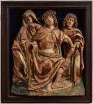 Bajor szobrász (Erasmus Grasser követője) Trónra ültetett Fájdalmas Krisztus, Mária és Szent János evangélista között, dombormű |