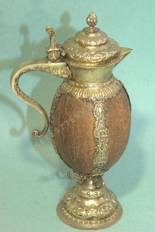 A csiszolt, de természetes erezetét megtartó kókusz-héjat négy öntött, trébelt, aranyozott ezüst pánt fogja közre. A pántok csapokkal kapcsolódnak a forgáskúp alakú talphoz, és a csőrös kiöntővel kialakított nyakrészhez. Az öntött fogót szintén csapok rögzítik. A fedél csuklós zsanérral záródik.