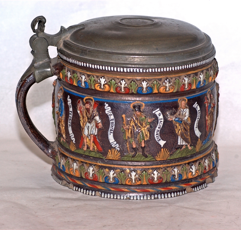 A bemutatott, barna mázas korsón, a 12 apostol ábrázolása történt, attribútumaikkal.