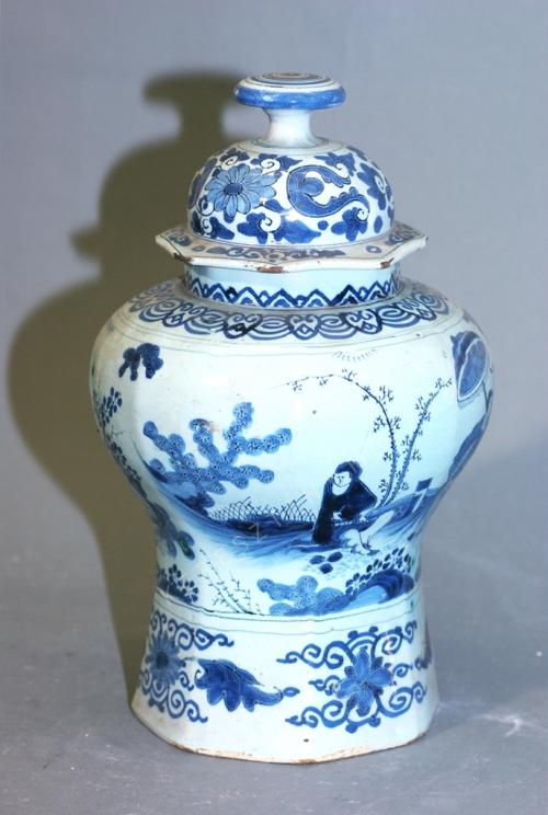 Máz alatti kék festéssel készült "chinoiserie" minták használatával. Erősen elnagyolt kínaizáló jelenetek váltakoznak a körte alakú edényen. Mind a nemesasszony fölé napernyőt tartó, hivatalnoki jelvényekkel ábrázolt férfi, mind a guzheng játékot (kínai pengetős, citera-szerű hangszer)imitáló zenész nem hiteles ábrázolás, csak az eredeti kínai porcelán-áruk díszítményeinek utánzása.