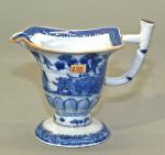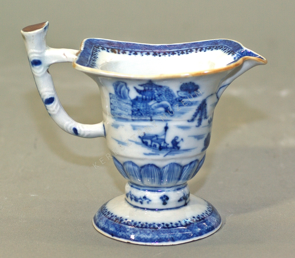 A fordított kúp alakú talphoz, rövid hengeres test kapcsolja a festett, lótuszvirágot idéző sziromkehelyből hengerpalásttal induló, de szögletes, szájperemmel és kicsúcsosodó kiöntővel végződő kannát. Füle túlnyúlik a szájperemen. Máz alatti festéssel pagodák, és folyón úszó halászcsónak díszíti.