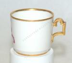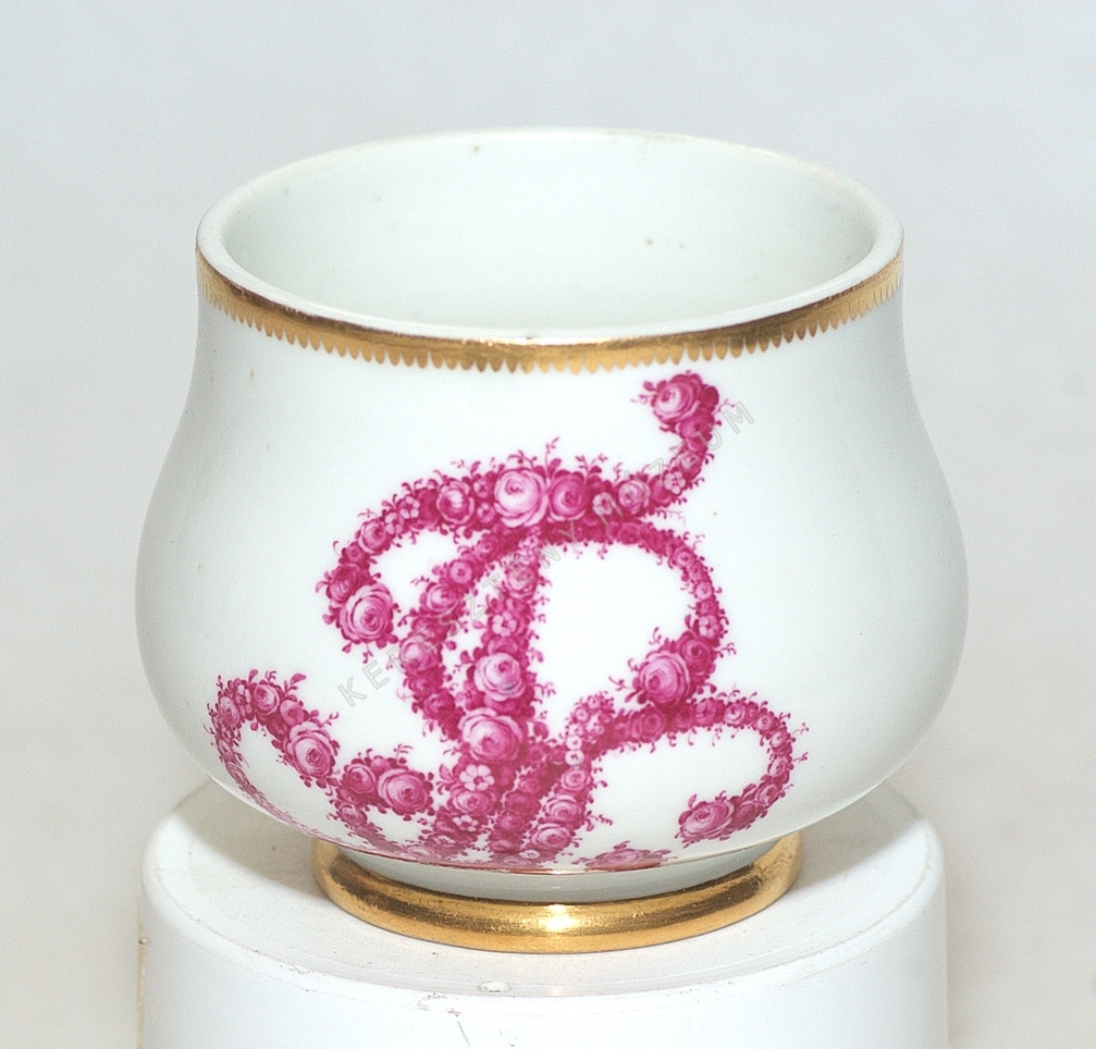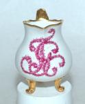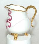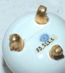 Aranyozott, levélsoros szájperem, és talpgyűrű, szélesedő has-részén rózsafűzérből font "TGC" - monogram. Valamikor fedél tartozhatott hozzá.