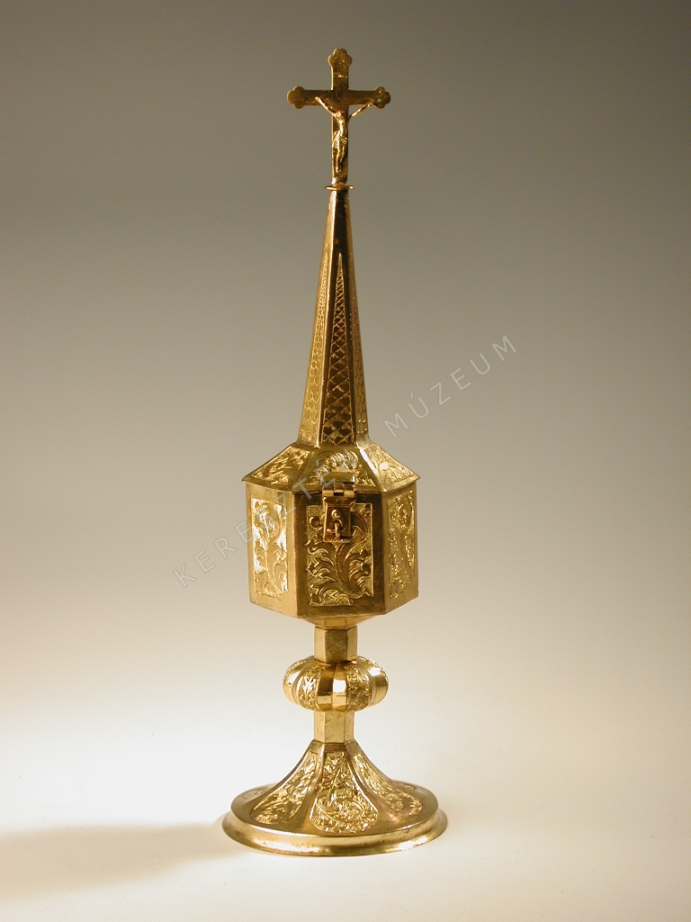 Síklapokból összeállított, hat oldalú edény. Lenyitható fedelén feszület.
