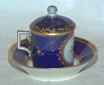 A csészét, fedelét és a tányért is sötétkék máz fedi, peremeken széles arany szegélyezéssel és virág fűzérrel. a tányér öblében és a csészén egy-egy színes virágcsokor.