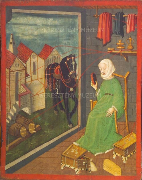 Osztrák, esetleg magyarországi mester munkája a ritka ikonográfiai típust megjelenítő festmény. A táblához egykor egy másik szárny is tartozott, mely tartalmilag is szorosan összefüggött a fennmaradttal. Azon imádkozó férfialak volt látható, s az ő gondolatainak téves irányát jelölik a tőle kiinduló és a jelen képen folytatódó vörös vonalak. A ruházkodásra, italozásra, kincsekre, nőkre pazarolt figyelem morális alapon elítélendő, helytelen. A tévelygések ellensúlyozására talán kapcsolódott az eddig említett képekhez egy olyan ábrázolás is, amely megmutatta a kívánatos erényeket, az imádkozó elmélkedéseinek helyes irányát.