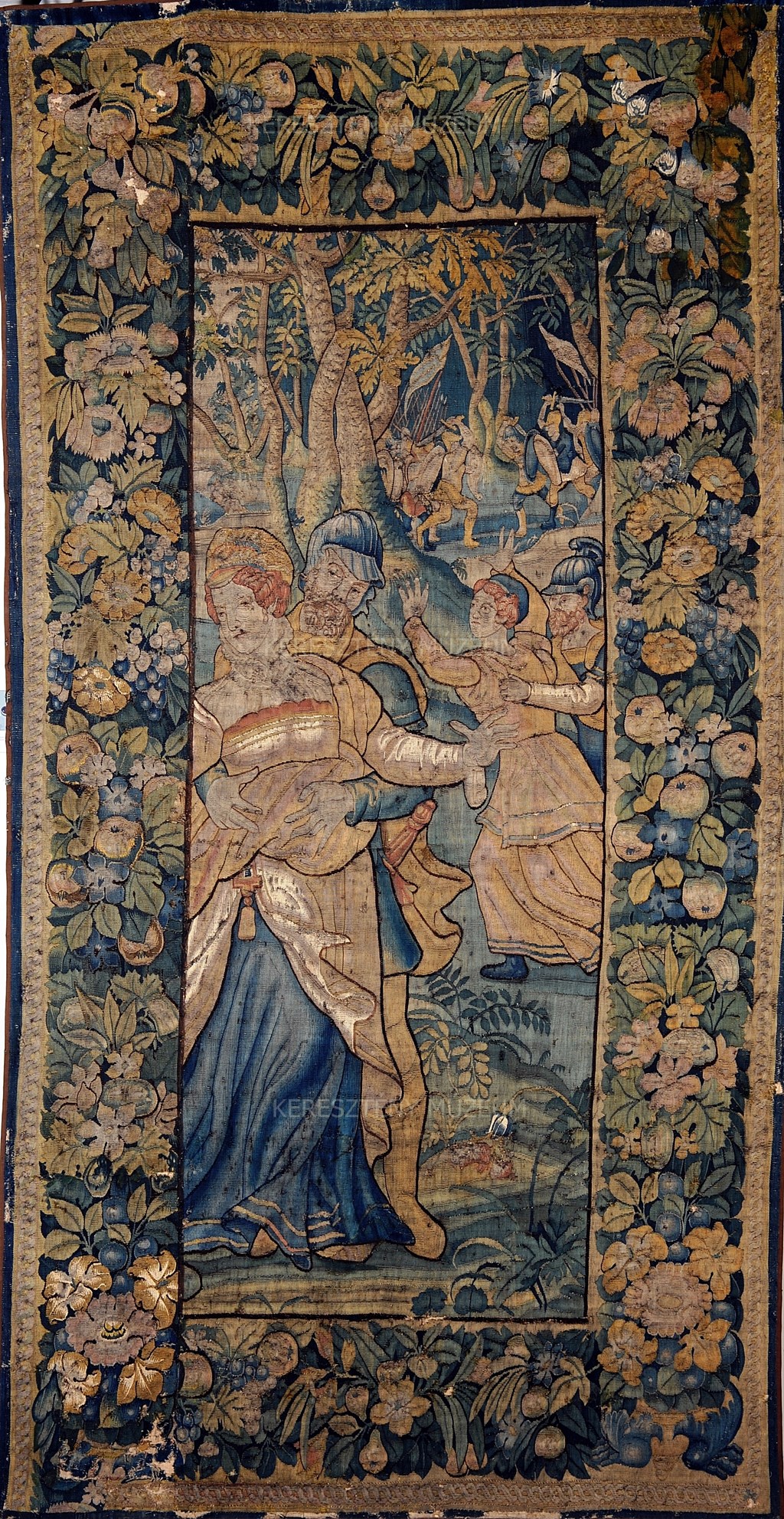 A magas és keskeny kárpit előterében egy szabin nőt megragadó római katonát látunk. A ruhája előtt, a bal szélen egy láb részlete lóg bele a képbe - utalva a kárpit töredékességére. A középtérben szintén egy szabin nő, és az őt üldöző római férfi. A háttérben katonák csoportja egymásba csavarodó törzsű fák között. A jelenet valószínűleg egy nagyobb kompozíció része lehetett. Kevés és tompa színből áll össze a kép, leginkább a sárga dominál. A hármas beosztású bordűrön a virág- és gyümölcskeret a legszélesebb; ezt keskeny rozettával csavart szalagkeret veszi körül. A képpel érintkező belső részen egy hangsúlyos, fekete, keskeny csík vonul végig.
