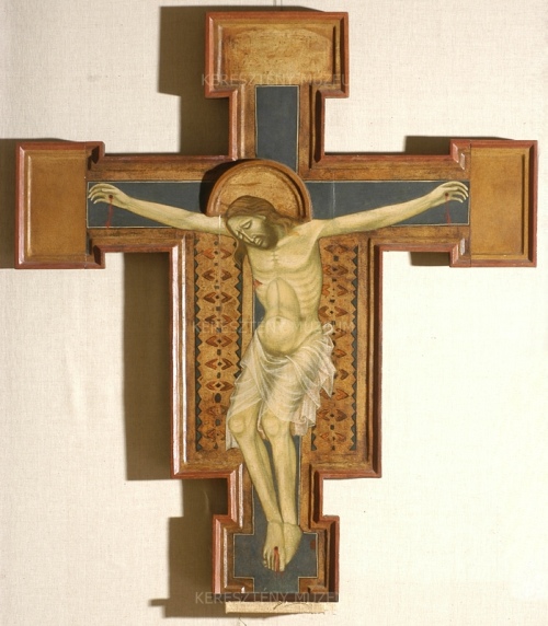 A Keresztény Múzeum egyik ritkasága ez a croce dipinta, vagyis festett kereszt. A 12. és 15. század között Itália sok templomszentélyét díszítette ehhez hasonló, a főoltár fölé függesztett vagy a a szentélyrekesztőre, szentélygerendára állított kereszt. A gyakran monumentális méretű, 4-5 méter magasságot is elérő kereszteken eleinte a halál fölött diadalmaskodó, élő, nyitott szemű Megváltó jelent meg, a 13. század során azonban a Jézus emberi mivoltát, testi szenvedéseit hangsúlyozó ferences teológia hatására ezeket a halott Krisztus ábrázolása váltotta fel. Az esztergomi kereszt is ez utóbbi típust követi. A halott test önnön súlya alatt S-alakba görnyed, a fej magatehetetlenül oldalra csuklik. A függőleges szár végződésében mára már erősen megkopott az ezüst betűkkel írt gótikus felirat, „IESVS NACARENVS REX IVDEORVM” – Názáreti Jézus, a zsidók királya. A vízszintes szár lezárásai modern kiegészítések, bennük eredetileg a sirató Szűzanya és Evangélista Szent János félalakja kaphatott helyet. A keresztet 1967-ben, magyar műkereskedésből vásárolta a múzeum.