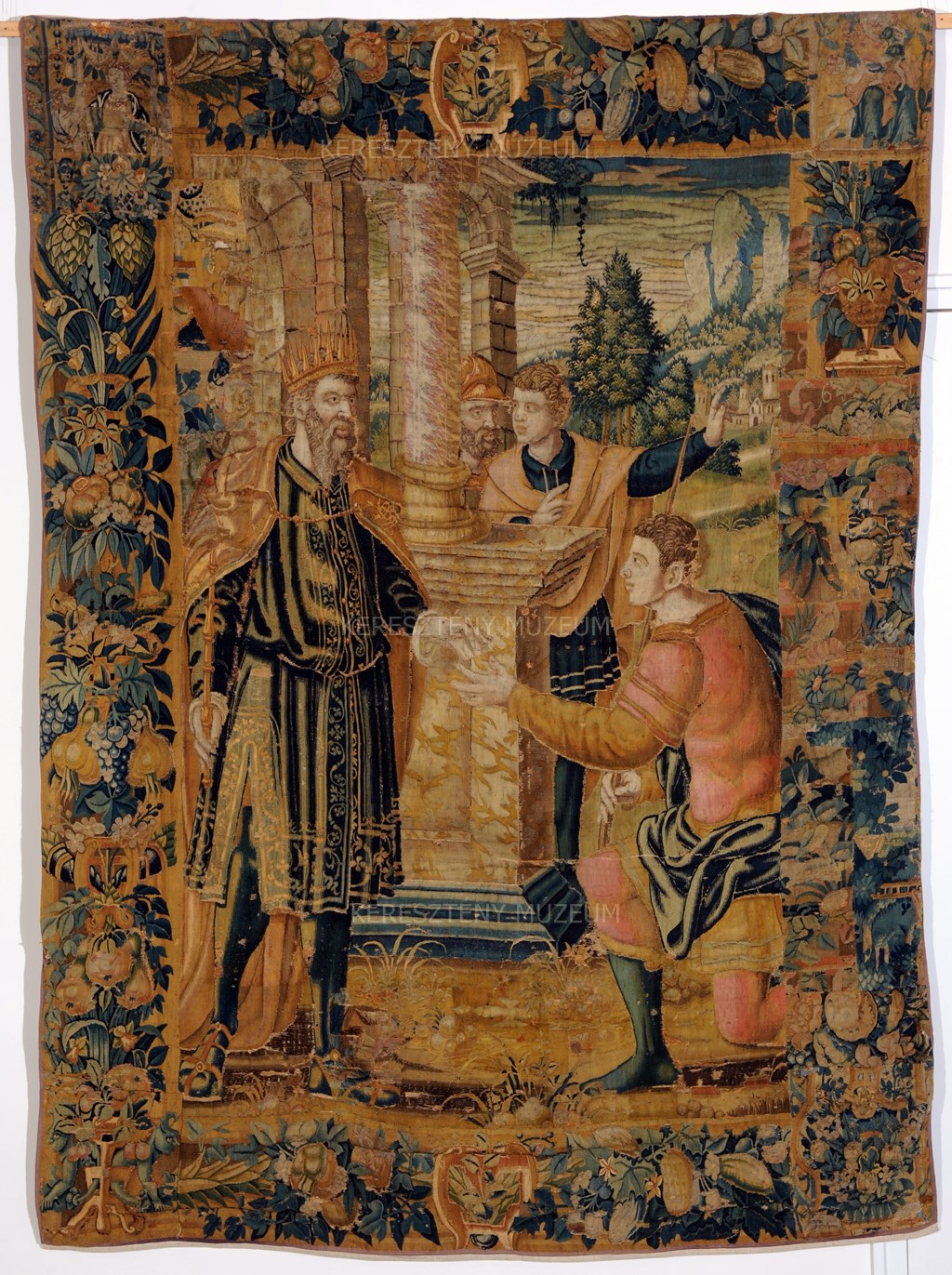 Tájképi háttér és oszlopos architektúra előtt játszódik a jelenet: a koronás, jogart tartó uralkodó előtt egy fél térdre ereszkedő alakot látunk. Az oszlopok mögött két férfi tűnik fel. A háttérben facsoportok, épületek láthatók, melyek fölé egy hegy magasodik. Gazdag gyümölcs- és virágmintás bordűr keretezi.