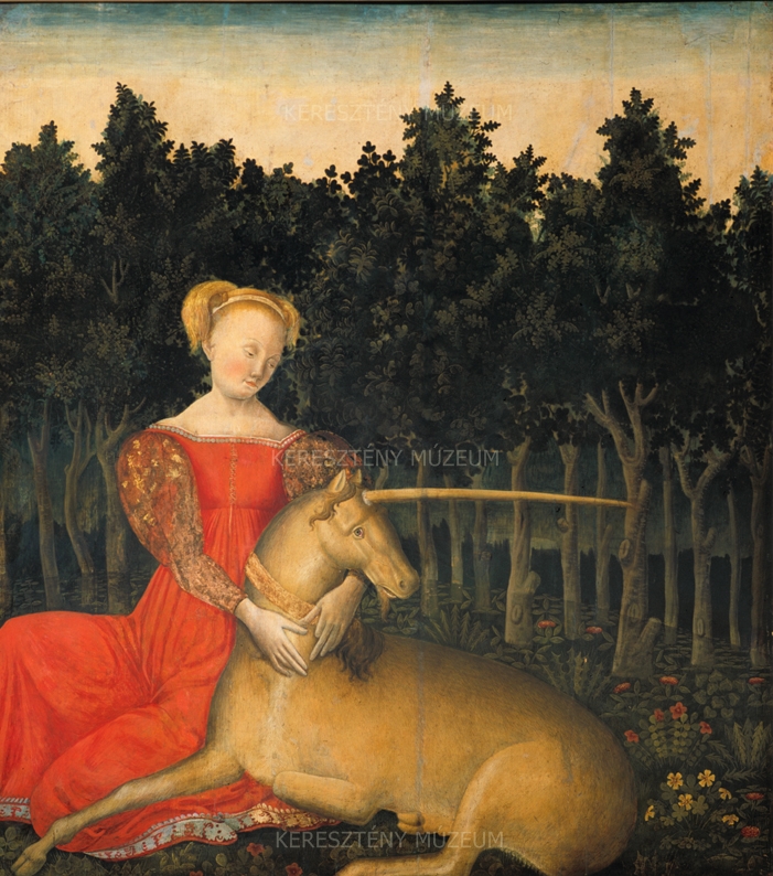 A mesebeli hangulatot árasztó, sötét erdővel övezett virágos tisztáson játszódó jelenet még a késői internacionális gótika hangulatát idézi. Az egyszarvút ölelő leány a tisztaság, szüzesség allegóriája. Az időszámításunk szerinti 2. században, görög nyelven íródott moralizáló természetrajz, a Physiologus szerint a befoghatatlan állatot csak egy szűz tudta megszelídíteni. A leány láttán az állat engedelmessé vált és ölébe hajtotta fejét, ahol a vadászok könnyedén elfoghatták. Az egyházatyák az unikornist Krisztussal azonosították, a szüzet pedig Máriával. A történet is keresztény értelmezést kapott: immár a Szűz ölében emberré váló és földi üldözői által elfogatott Megváltóra vonatkozott. A szarv az isteni erő, az Atyával való egység, és a mindent átható ige jelképe lett. A középkorban népszerű téma sok ábrázolása fennmaradt, rajtuk a leány vagy maga Szűz Mária gyakran a szüzességet jelképező zárt kertben jelenik meg. A körbezáruló erdő is erre utal az esztergomi képen. A kép egykor talán egy világi rezidencia falburkolatba illesztett díszítésének volt része. Ismeretlen alkotója, aki stílusából ítélve a velencei Antonio Vivarini hatása alatt dolgozhatott, a baltimore-i Walters Art Museumban őrzött, Párisz és Helené történetét ábrázoló sorozatról kapta szükségnevét.