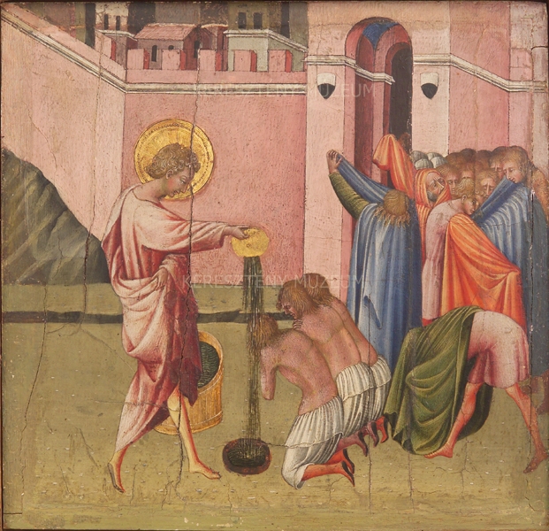 A legenda szerint Siena városának népét egy római katona, Szent Ansanus térítette keresztény hitre. A képen épp a keresztség felvételének pillanatát láthatjuk a sienai fekete-fehér címerrel jelzett városkapu előtt. Jobbra a sienaiak egy nagy csoportja a szertartásra készülve széles mozdulatokkal, komoly arckifejezéssel szabadul meg ruháitól. A könnyed léptű, bő köpenybe burkolózó fiatal szent a mögötte látható jókora dézsából meri a vizet az előtte térdepelő három neofita fejére. A kisméretű tábla egy ismeretlen, a város védőszentjeként tisztelt szent életét ábrázoló sorozat része volt, melyből egy másik darab is fennmaradt. Ezen Ansanus lefejezése látható (Firenze, Museo del Bargello). A 15. század legegyénibb hangú sienai festője, Giovanni di Paolo a század nagy részét felölelő munkásságának középső periódusában festhette ezt a megkapó jelenetet. A vetett árnyékokat figyelmen kívül hagyó, expresszív fénykezelés, az élénk színvilág, a ritmikus csoportfűzés és a torzított perspektíva a festő sajátos, meseszerű képi világának fontos alkotóelemei.