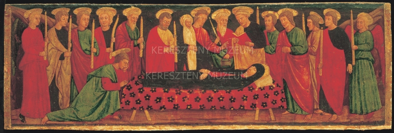 Az apokrif legendán alapuló ábrázolástípus a bizánci művészetet követve terjedt el Itáliában. A gyertyát tartó apostolok és angyalok sora előtt fekvő Szűzanya mögött Krisztus jelenik meg, hogy anyjának gyermek formájában ábrázolt lelkét magához vegye. A kevés változatossággal megjelenített szereplők teljesen kitöltik a szűk teret, a paletta néhány egyszerű színre – piros, zöld, sárga – korlátozódik. A kép egykor a firenzei Santa Maria alle Querce kápolna oltárképéhez tartozott, amelyet a Mannelli család megrendelésére festett 1460-ban Masolino késői követője, Paolo Schiavo. Az oltár szignált és datált egykori főtáblája Mária mennybemenetelét ábrázolja (ma Firenze, Museo di Sant’Apollonia), alatta a predellán a Szűzanya életének ezt megelőző három jelenete volt látható: az első képen egy angyal jelentette ki Máriának halála közeledtét (elveszett), a másodikon, az esztergomi képen, Mária halálát látjuk, a harmadik Mária temetését ábrázolja (Köln, Erzbischöfliches Diözesanmuseum).