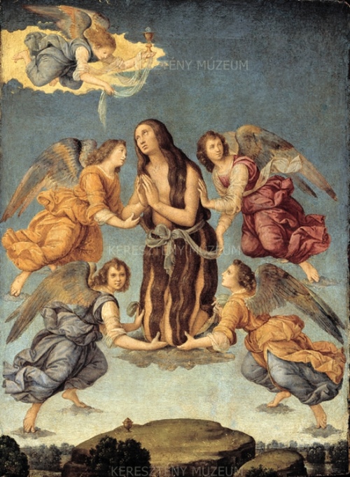 A 13. századi Legenda Aurea elbeszéli, mint jutott a bibliai bűnös asszony, Mária Magdolna tizennégy évvel Jézus mennybemenetele után egy csodás hajóúton Marseille kikötőjébe, ahonnan a pusztaságba húzódott vissza. Élete hátralévő részét itt töltötte remetei magányban és vezeklő önmegtagadásban. Táplálékául csupán mennyei eledel szolgált: miközben az angyalok magasba emelték, égi harmóniákat hallott, s ez úgy betöltötte, hogy testi táplálékra már nem volt szüksége. A kompozíció előképeként Pollaiuolo staggiai festménye szolgált, de Verrocchio szobrászati alkotásainak hatása is kimutatható, például a pistoiai dómban található Forteguerri síremléké, amelynek kivitelezésénél Lorenzo di Credi segédként dolgozott. Az a korábban megfogalmazott provenienciai feltételezés, mely szerint a képet Ippolito d’Este (1479 k. - 1520) hozta Magyarországra, nem bizonyult igaznak: a képet Simor prímás vásárolta 1878-ban Rómában Raffaele Bertinelli kanonoktól. A festmény egy gyengébb kivitelezésű változata a philadelphiai Johnson gyűjteményben található.