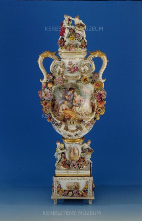 Meisseni díszváza utánzata, az eredetiről sok másolat és változat készült. Meissenre utal a vázán szereplő kettős címer is: II. (Erős) Ágost szász választófejedelem és lengyel királyé. A hatalmas, tipikus meisseni díszítéssel megformázott, színes virágokkal, rokokó életképpel díszített vázát – a hagyomány szerint – Csernoch János hercegprímás kapta az utolsó magyar király koronázásakor, 1916-ban.