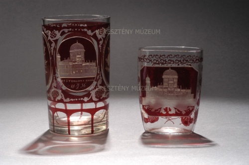 Az esztergomi bazilika felszentelésére (1856. augusztus 31.) Scitovszky János hercegprímás meghívta az ország vezető rétegét, köztük Ferenc József megkoronázatlan királyt is. A dísz-ebéd asztalán minden vendég előtt három (aperitíves, boros és vizes) pohár volt a Bazilika és az alkalmi felirat csiszolatával. Ezeket minden vendég magával vihette. A kor kedvenc díszítőeleme volt a bíbor-vörös üvegmáz, melyen az ábrázolás és a felirat az üveg természetes színével előcsillan. Észak-Magyarország hutáiban sok hasonlót készítettek.