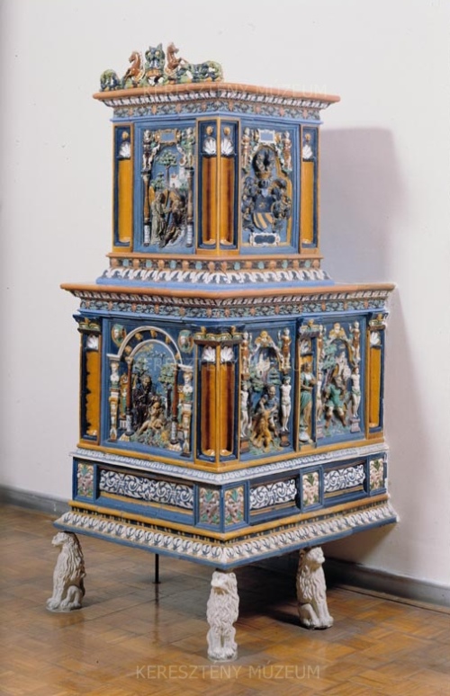 Az oroszlánformájú lábakon álló késő-reneszánsz cserépkályha pazar díszítésében figuratív jelenetek is helyet kaptak. Az előoldal fölső jelenetén Tóbiás jelenik meg, akit Rafael arkangyal a halhoz vezetett, hogy annak epéjével apja vakságát meggyógyítsa (Tóbiás 6, 2-9). Alatta Éva teremtésének a középkorban szokásos ábrázolását láthatjuk: a Teremtő az első asszonyt az alvó Ádám oldalából, a borda helyéről húzza elő (Teremtés 2, 20-22). A kályha oldalán két címert és az ószövetségi Sámson életéből vett jeleneteket találunk: Sámson az oroszlánnal harcol, Gáza városának kapuszárnyait viszi, majd kidönti a filiszteus fejedelmi ház oszlopait (Bírák 14, 16). A cserépkályha, mint új típusú fűtőberendezés, a mai Svájc területén jelent meg a 13. században. A hideg Közép- és Kelet-Európai területeken hamar kedveltté vált számos előnye miatt: fűtőhatásfoka jó, a szobában tartózkodók zavarása nélkül, kívülről fűthető, füstöt nem enged a szoba légterébe. Torony formájú szerkezete reprezentatív dekorációra kiválóan alkalmas volt. Ez a darab San Marco gróf iparművészeti tárgyakban gazdag főúri gyűjteményéből került a Keresztény Múzeumba.
