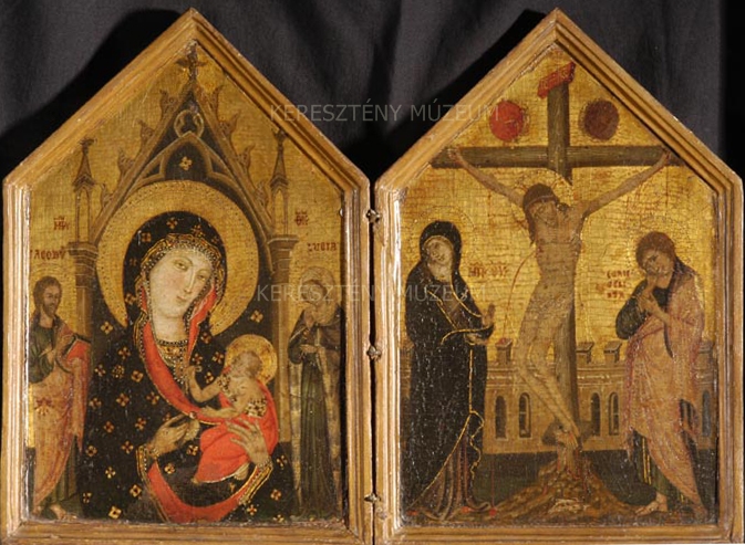A diptychon bal szárnyán a félalakos Madonnát két egészalakos szent, Szent Jakab és Szent Lucia veszi közre. A hirtelen léptékváltás oka a Madonna ikonszerű megjelenítése. A gyermek jobb kezével Mária kendőjének végét húzza magához – egy korabeli, népszerű Madonna-típusnak megfelelően –, baljával az eljövendő szenvedésre utaló madár, a tengelice után nyúl. A jobb szárnyon a holt Megváltó függ a kereszten. Patakzó vére a sirató Mária és János apostol fejére, a Jeruzsálemi templomot szimbolizáló falra, s a földre hull. Mária szívébe a fájdalmát jelképező és a compassióra utaló apró aranytőr fúródik. A kereszt fölött a Nap és a Hold korongja jelenik meg, a kozmikus tragédiára, a föld Jézus halálakor bekövetkezett elsötétedésére utalva (Mt 27,45, Lk 23,44-45). A síkszerű ábrázolásmód és a sematikus formák még a bizánci művészet hatását mutatják, a Madonna fölé magasodó karcsú kőtrónus törékeny fiáléival és kúszóleveleivel viszont a gótikus építészet ismeretéről tanúskodik. Velencében, mely mind a nyugati, mind a keleti világgal szoros kulturális, politikai és kereskedelmi kapcsolatokat tartott fenn, a bizánci és gótikus stílusjegyek vegyülése általános a trecentóban. A kettős irányultságot a képen olvasható görög és latin nyelvű feliratok keveredése is jelzi. A rendkívüli gonddal megfestett, összecsukható diptychon egykor magánájtatosságra szolgált. Külső oldalait szalagfonattal átszőtt öt-, illetve hatágú csillagmintás motívum díszíti.