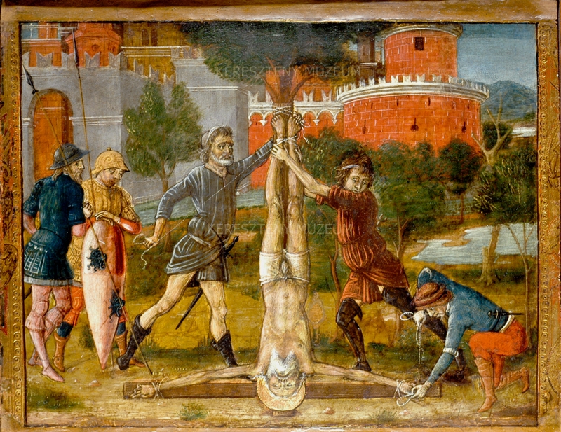 A kép az apostolfejedelem, Szent Péter mártíromságát ábrázolja, akit Rómában, a hagyomány szerint a Tiberis nyugati oldalán húzódó Gianicolo hegyen feszítettek keresztre. Ma a hely emlékét a San Pietro in Montorio templom őrzi. A kivégzés a szent saját kívánságára fejjel lefelé történt, minthogy nem tartotta magát méltónak a Krisztussal azonos módon való megfeszítésre. Nem tudunk arról, hogy a predella mestere járt volna Rómában, a széles körben elterjedt ábrázolásokról azonban mindenképp ismerhette a helyszínt. Jobbra a Tiberis folyó kanyarog és a pápai vár – korábban Hadriánus császár mauzóleuma –, a Castel Sant’Angelo tűnik fel. A kép predella töredéke, amelyből még három jelenet ismert. Az összes darabon fennmaradó, különböző mintájú díszítősávok maradványai alapján a jelenetek eredeti sorrendje is megállapítható: Szent Bernardin feltámaszt egy gyermeket (Magángyűjt.), Heródes lakomája (Glens Falls, New York, The Hyde Collection), Kálvária (Manchester, City Art Gallery), az itt látható Szent Péter keresztrefeszítése, végül egy elveszett ábrázolás következett. A gyors, gyakorlott mozdulatokkal felvázolt jelenetek leginkább Matteo di Giovanni 1480-as Celsi-oltárának predellájával vethetők össze (Siena, Museo dell’Opera del Duomo).