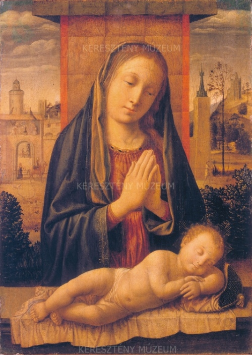 A szelíd arcú, vörösesszőke Mária csendben, imádattal fordul békésen alvó Gyermeke felé. Az alvás motívuma itt a Passióra, Jézus eljövendő halálára utal. A mellvédfalra, a kisded alá terített fehér kendő is az áldozati szerepet hangsúlyozza: rajta nyugszik az „élő kenyér”, mint a miseáldozaton az ostya a corporálén. A baldachin mögött kibontakozó tájat északias, gótikus épületek tagolják. A városkaput az Angyali üdvözlet freskója díszíti, fölötte az örök életet szimbolizáló két páva ül. Apró staffázsfigurák teszik életszerűvé a hátteret: lovast kísér a kutyája, a kapun rúdon kosarakat vivő asszony lép be, vándor ballag a tájban. Mária aprólékosan megfestett, ékköves és hímzett szegélyű ruhája a németalföldi festészet dekorativitását és részletgazdagságát idézi. Az északi és velenceies elemek mellett a kép stílusában a lombard iskolára jellemző jegyek dominálnak. A szakirodalom korábban a bresciai Vincenzo Foppa (1430 k.-1515/16) követői közé helyezte a kép egyelőre ismeretlen alkotóját, újabban a képet több kutató Bernardino Luini (említik 1501-ben - meghalt 1532-ben Milánóban) fiatalkori művének tartja.