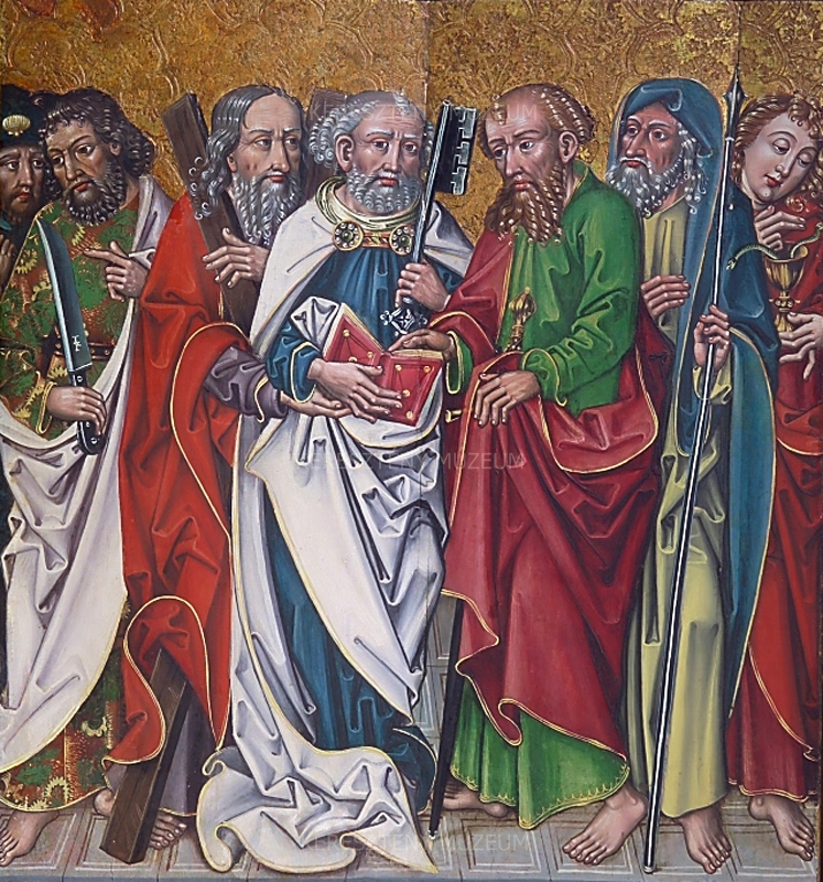 A Szatmár megyei Csegöld község templomából vásárlás útján jutott el a múzeumba a nagyméretű szárnyasoltár fennmaradt három nagyobb és négy kisebb táblája. Az oltárszekrény középső szobra elveszett, de feltételezhető, hogy egy életnagyságú Madonna szoborról volt szó. A mester B.E. monogramja a három mozgatható szárny egyikének hátlapján volt olvasható az 1494-es dátummal együtt. A belső, ünnepi szárnyoldalakon a tizennégy segítőszent, valamint hét apostol látható. A többi apostolt felsorakoztató, negyedik szárnykép elveszett. A zsúfolt csoportot ábrázoló szárnyak külső oldalán három, Martin Schongauer metszetei alapján festett passiójelenet kapott helyet, melyek hétköznap voltak láthatóak a csukott oltáron. A mester stílusa közel áll a felvidéki bányavárosi iskola kései korszakához. A tömbszerű, kemény rajzolatú alakok teljes magasságában kitöltik a képfelületet. A részletmegoldások a ruhák, az attribútumok, az angyalok és hangszereik megfestése, jól felkészült egyéni leleményekben bővelkedő mesterre utalnak.