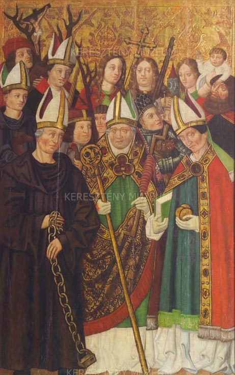 A tizennégy segítőszent ugyancsak a földi halandók imáit segíti, erősíti. E csoportos ábrázolás a 15. század századtól terjedt el Európa szerte. Szt. Lénárt, Szt. Erasmus, Szt. Miklós, Szt. Egyed, Szt. Vid, Szt. Achatius, Szent György, Szent Pantaleon, Szt. Kristóf, Szt. Eustachius, Szt. Balázs és három női szent: Margit, Katalin és Borbála, valamennyien közvetítettek, közbenjártak a segítségükért fohászkodó híveknek. A szerényebb tehetségű festő az ún. bányavárosi iskola hagyományait folytatta, de alakjai robosztusabbak, színskálája szűkebb, néhány erőteljes lokális színre összpontosít.