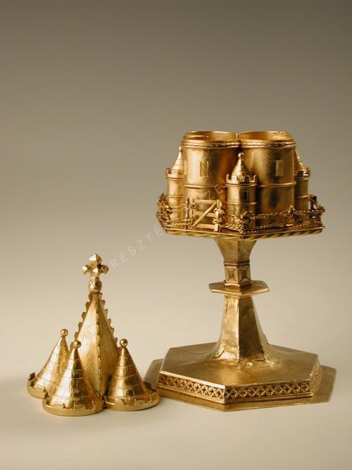 Több tornyos kápolnát mintázó ereklyetartó, sodronyból font kerítéssel. csúcs torony hatoldalú, lapokkal fedett, levehető tetőt alkot, liliomos csúcsdísszel.