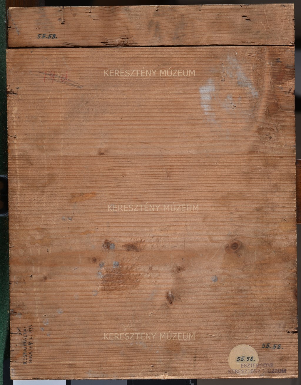 Összetartozik az 55.59 számon nyilvántartott, Kálváriát ábrázoló táblaképpel. Mindkettő enyhén körülvágott, ezért jelenlegi egyező méretük nem bizonyítaná egyértelműen eredeti együvé tartozásukat. A Sallay Dóra kutatásainak részeként végzett faanyagvizsgálat alapján azonban egyértelműen megállapítható, hogy a két ábrázolást eredetileg egyazon fatábla két oldalára festették, amelyet később kettéfűrészeltek, az ábrázolásokat pedig körülvágták. Mindkét festményt új hordozóra ültették át.