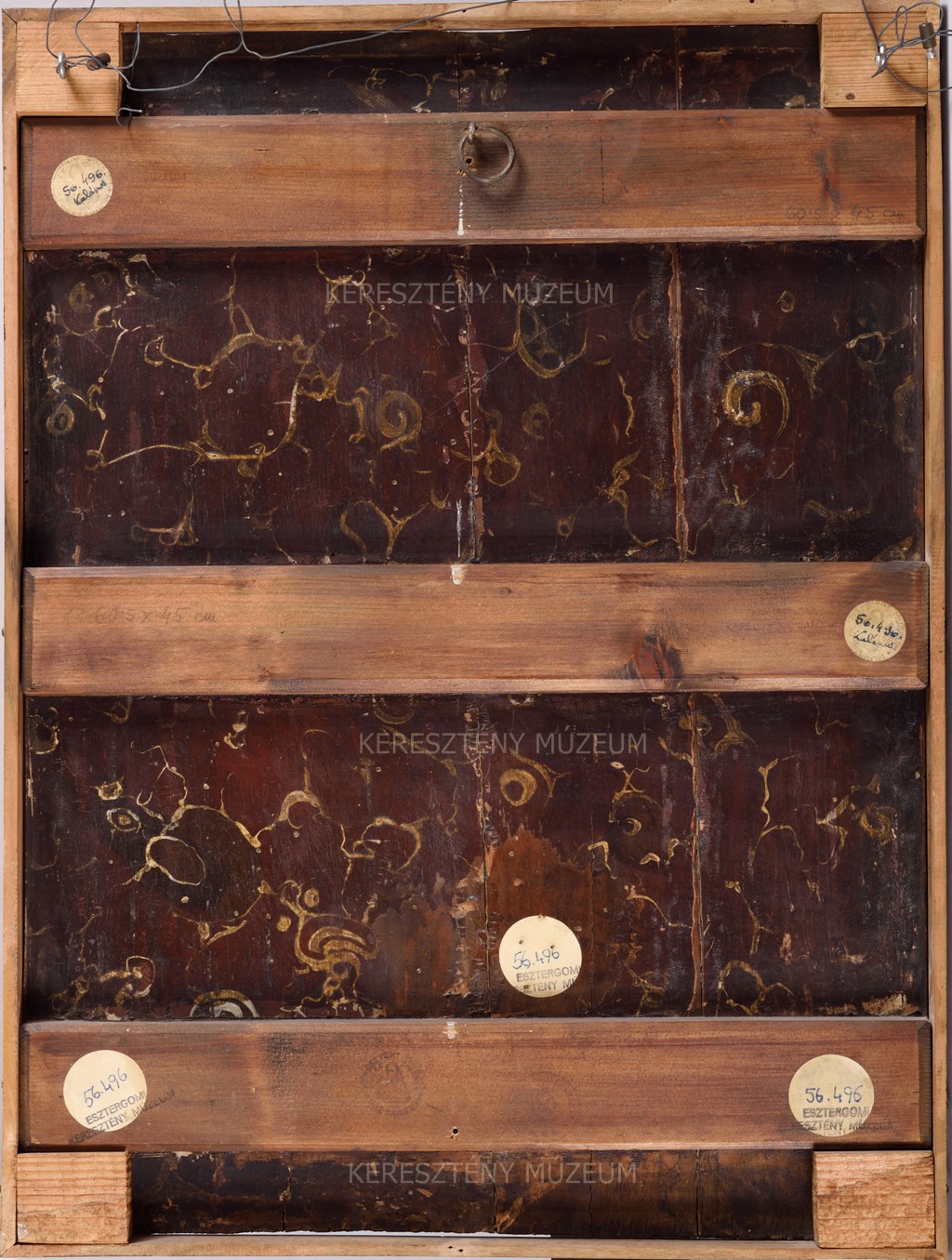 A tábla hátoldalán vörös-fehér márványt imitáló díszítőfestés látható.