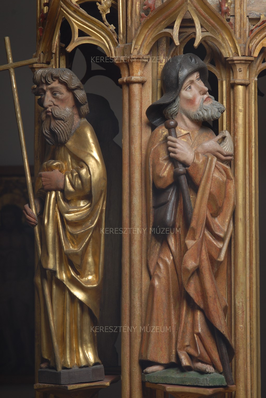 A z ú.n. bejárati oldal két szoborfülkéje és a bennük álló apostolszobrok a bécsi restaurálás idején, Johann Hutterer szobrász műhelyében készültek, de számos más részlet is későbbi kiegészítés. Az eredeti elemek azonosításához alapos restaurátori vizsgálat lenne szükséges.