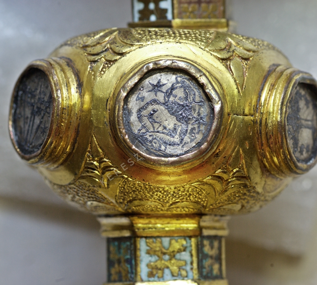 Lapított nódusán foglalatba rögzített, tausírozott ezüst képek Krisztus szenvedéstörténetéből. Nódus alatt és felett, a szár zománcozott, a kúpos alakú cuppa újabb, ezüst, levél alakban kiképzett csészében kapcsolódik a szárhoz.