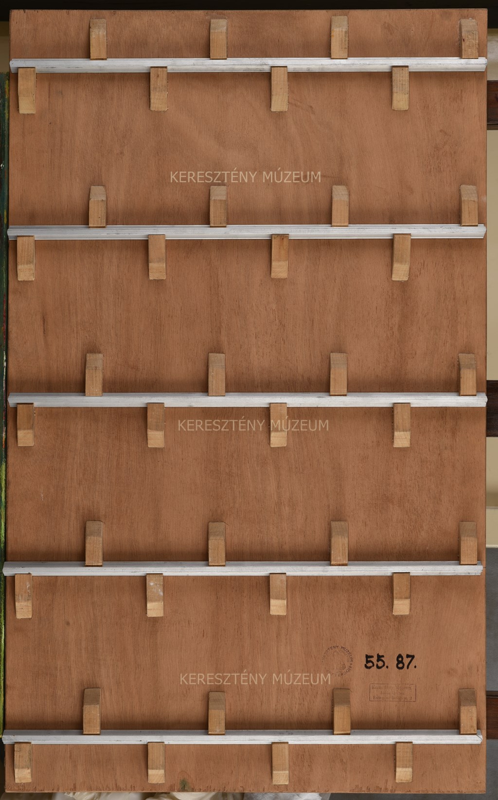 Az eredetileg mindkét oldalán festett, Szent Miklóst a három ifjúval ábrázoló, 55.85 számon nyilvántartott hátoldalától fűrészeléssel szétválasztott táblakép az 55.86 számú, Szent Miklós legendájának egy további részletét ábrázoló, valamint az 55.88 számú, Keresztvitel-jelenetet mutató táblaképekkel együtt egyazon mozgószárnyhoz tartozott.