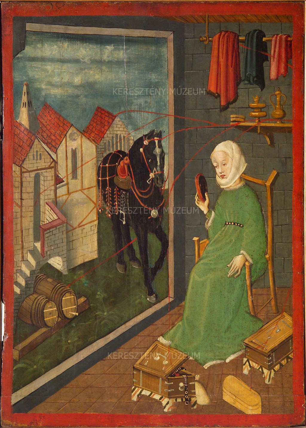 Blasius Höfel bécsújhelyi gyűjteményéből Karl Lemann, majd Ipolyi Arnold gyűjteményébe került. “154. Kettős kép fára festve. Tryptychon részlete. Előlap: Krisztus az Olajfák hegyén (átfestve). Hátlap: Szobában ülő zöldruhás nő, az ajtó előtt felnyergelt paripa. XV-XVI. sz. (Német?)” (Lakatos-Balla 275)